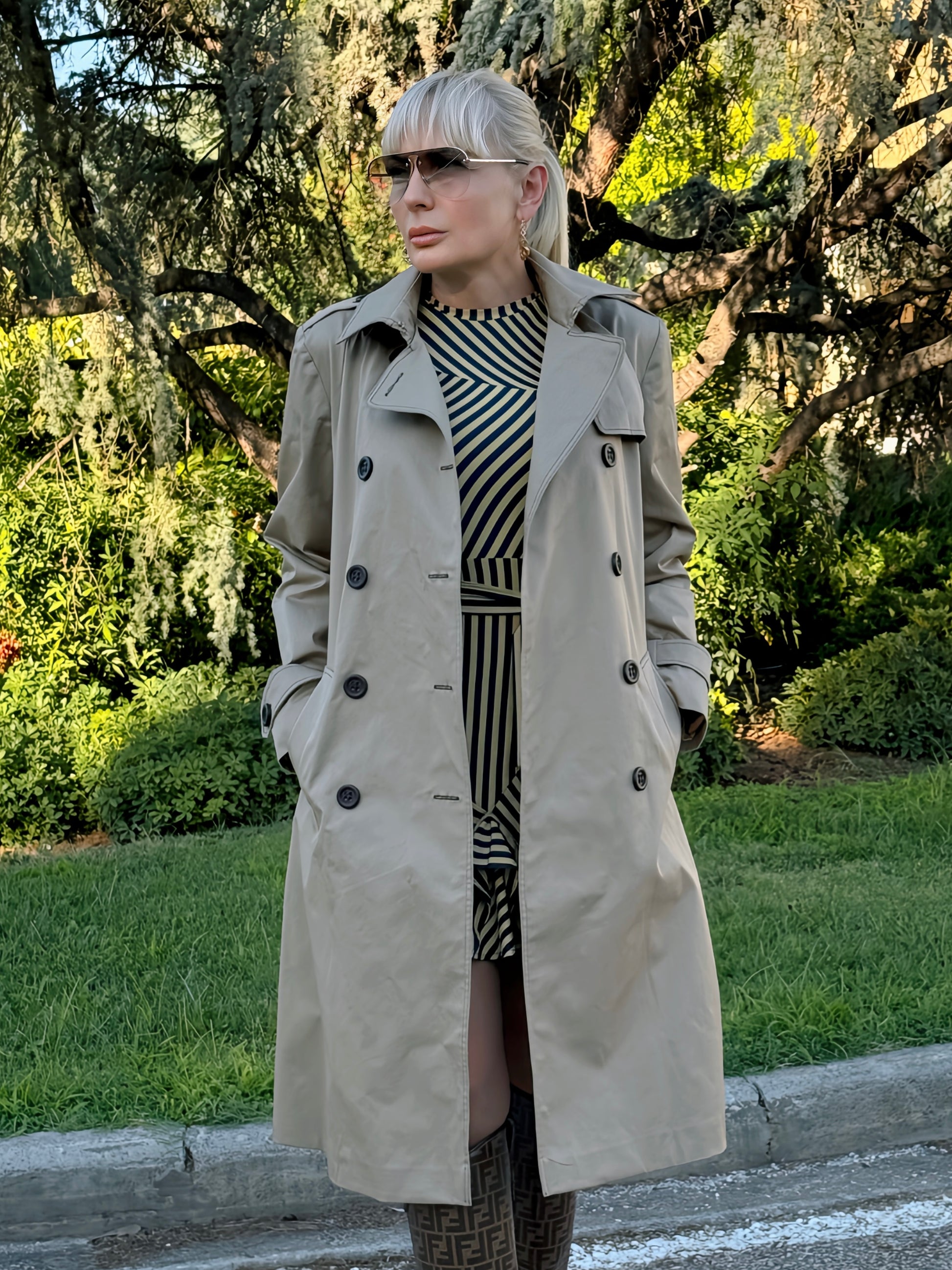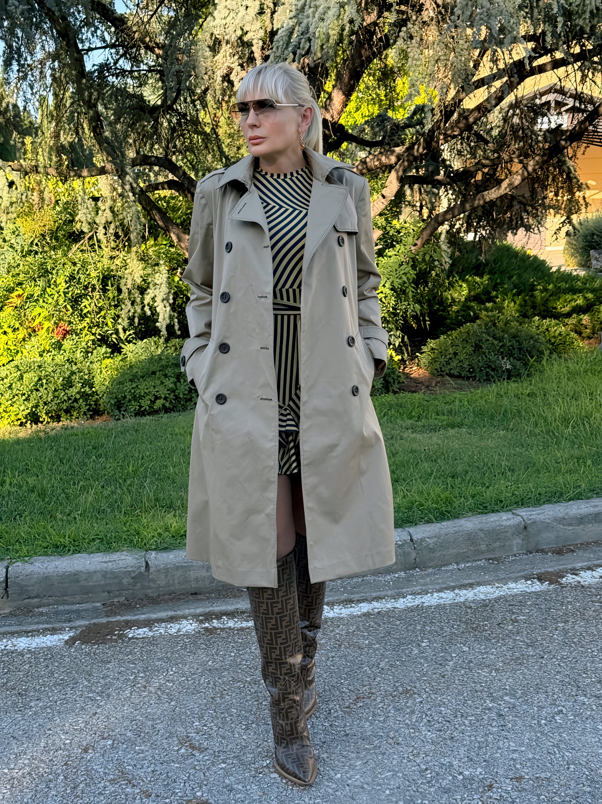 Дългият бежов шлифер с колан съчетава класическа елегантност и модерен силует, подчертавайки талията с изчистена и стилна линия. Обемните кафяви копчета добавят акцент към дизайна, придавайки изискан и завършен вид.