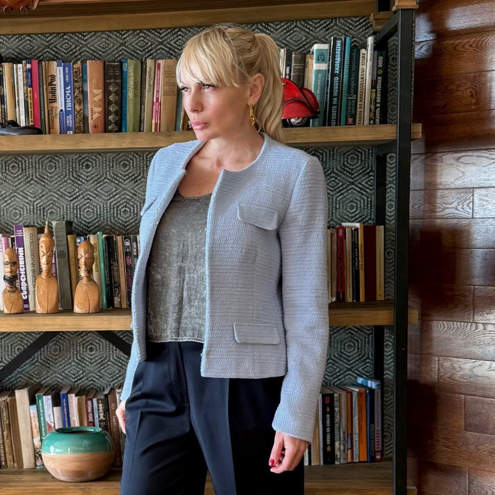 Модерно късо сако в нежно светлосиньо, което придава елегантен и свеж акцент на всяка визия. Изработено от висококачествена материя, то е с изчистен силует и стилно закопчаване отпред, което осигурява прецизно оформен силует. Дължината му подчертава талията и го прави перфектно за съчетаване както с панталони с висока талия, така и с поли или рокли. Идеален избор за елегантни и модерни визии.